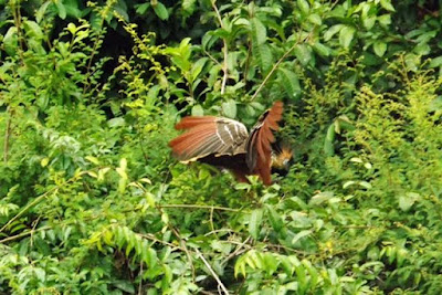 We slipped and slided along 6km of muddy swamps avoiding trees crawling with fire ants or tree bark covered in spikes. It was a relief at last to reach the lake and board a canoe for an hour or so, taking in the local wildlife including giant otters, long-nosed bats, agami heron and hoatzin - or stinky bird as it's known.